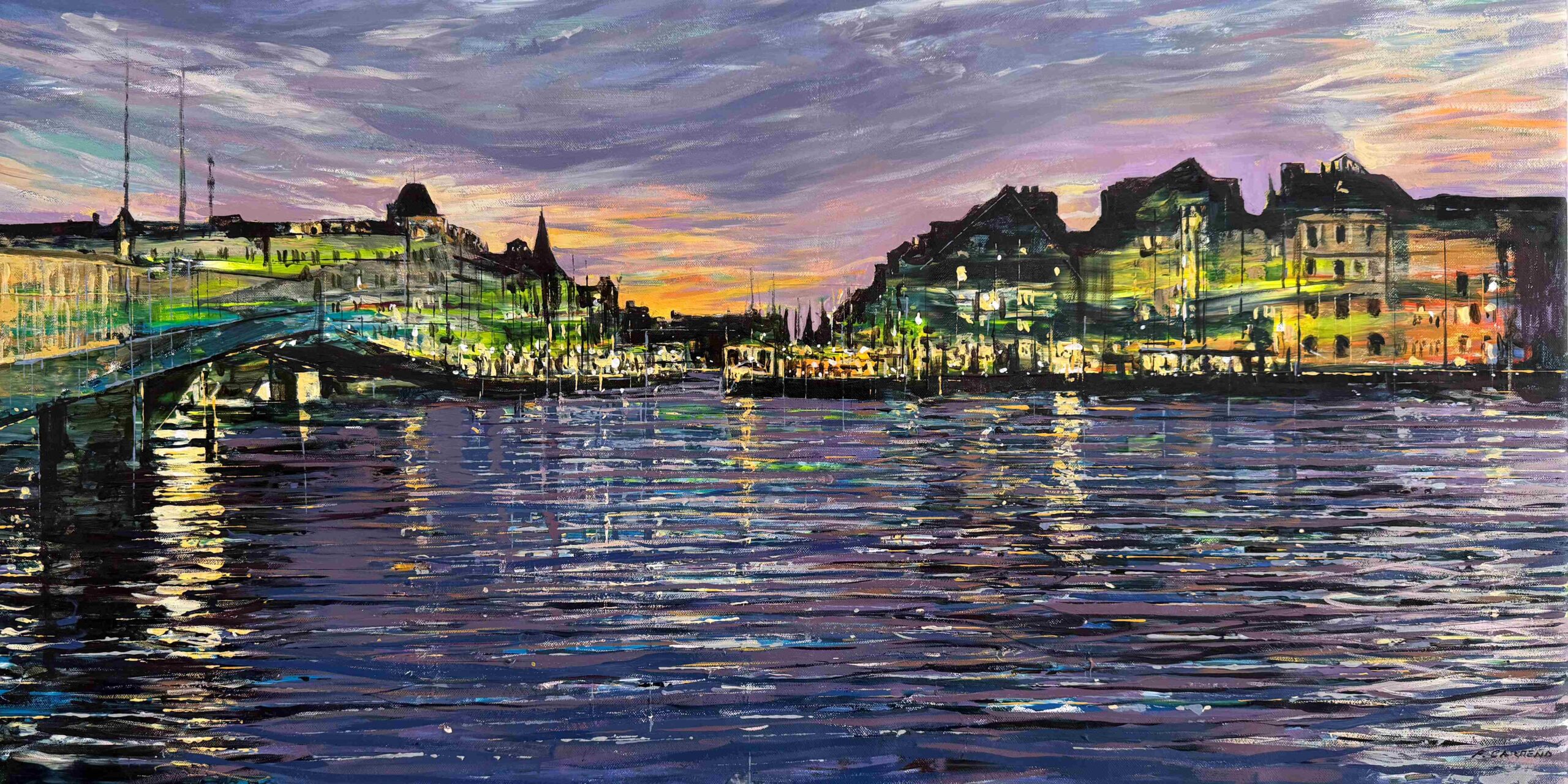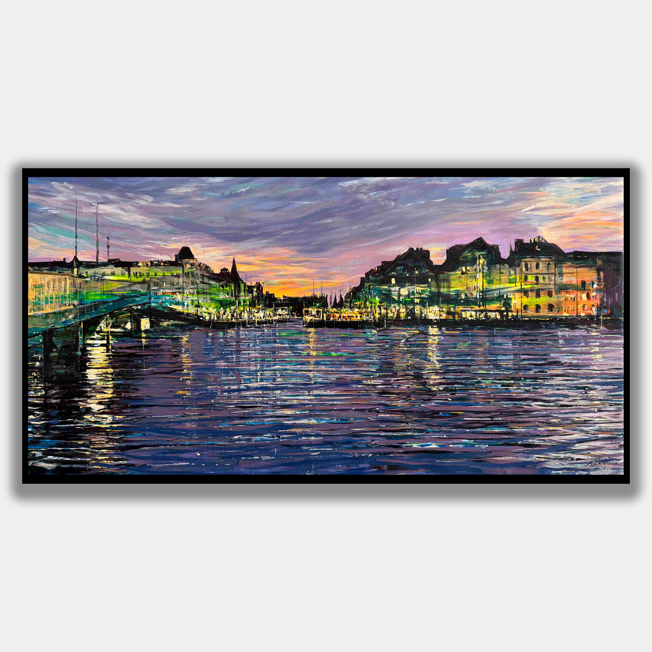 De brede, energiske penselstrøg og de dybe farvetoner skaber en stemning af byliv i overgangstimen, hvor dagen glider over i aften. Lyset fra kajens bygninger spejler sig i vandet og giver værket en levende, næsten musikalsk rytme.
