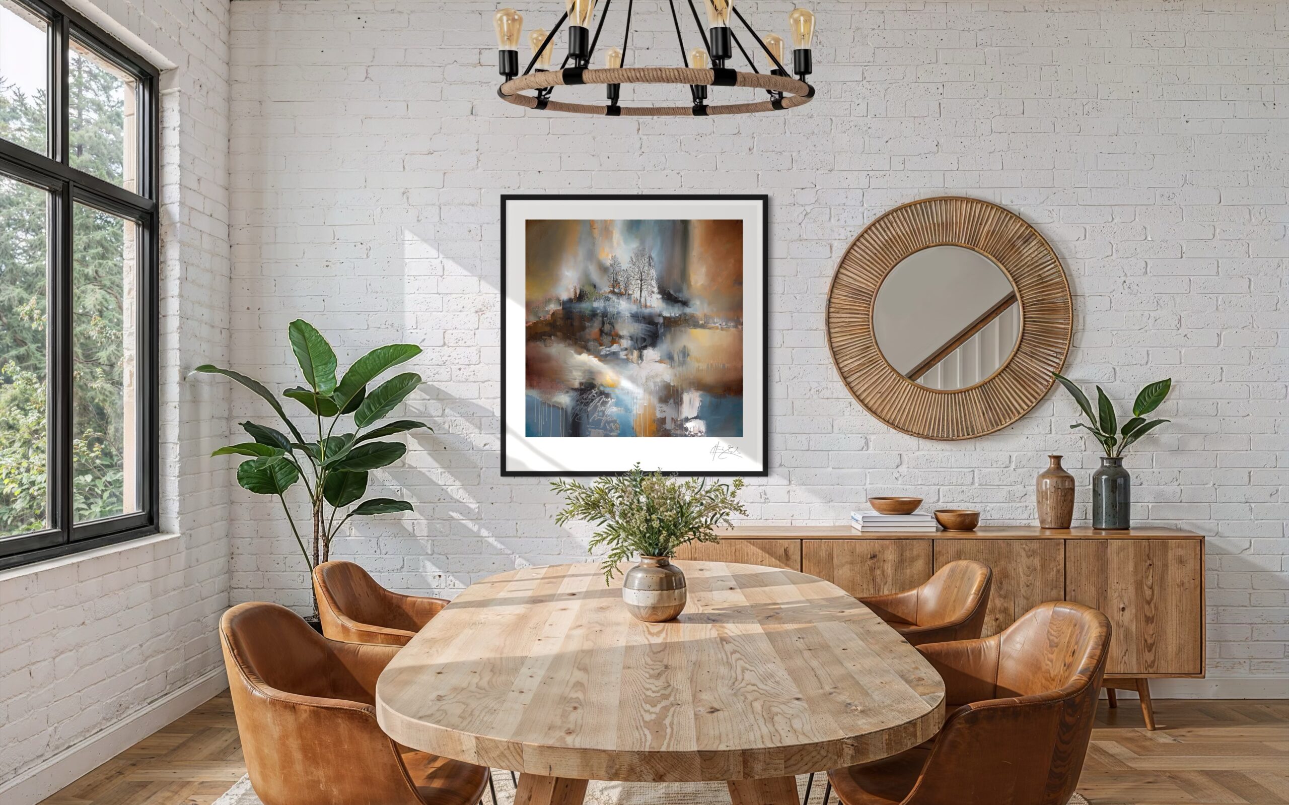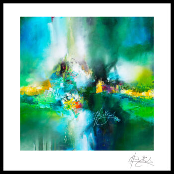 Farverne smelter sammen i et spil af lys og dybde, hvor det abstrakte og det figurative mødes i perfekt balance.