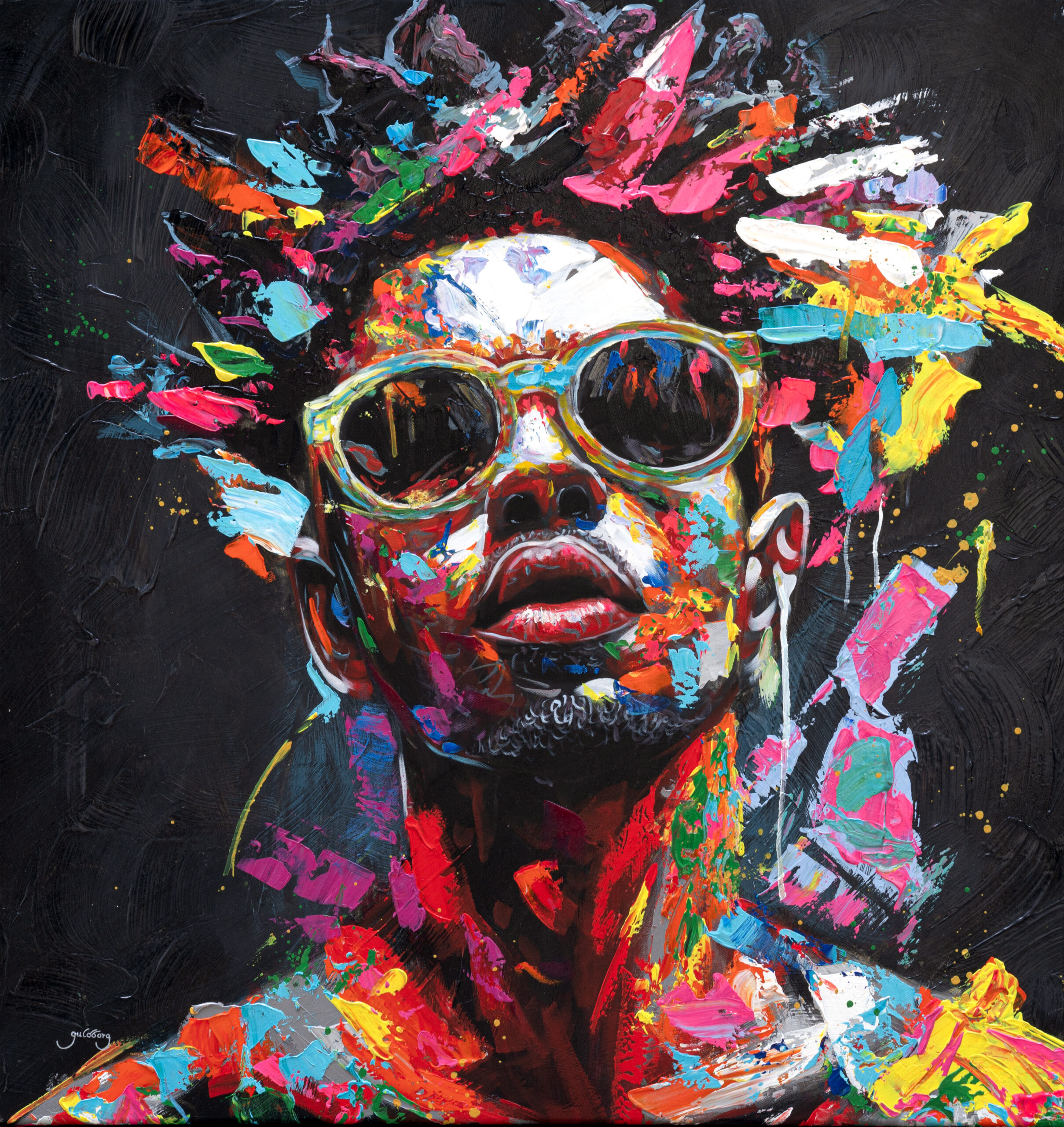 “Matteo” er et portræt med kraft og attitude. De tykke, farvede penselstrøg lægger sig i rytmiske lag hen over ansigt og hår, som om farverne selv har puls. Mod det mørke bagtæppe træder figuren tydeligt frem, intens og levende, med et blik der møder rummet direkte.