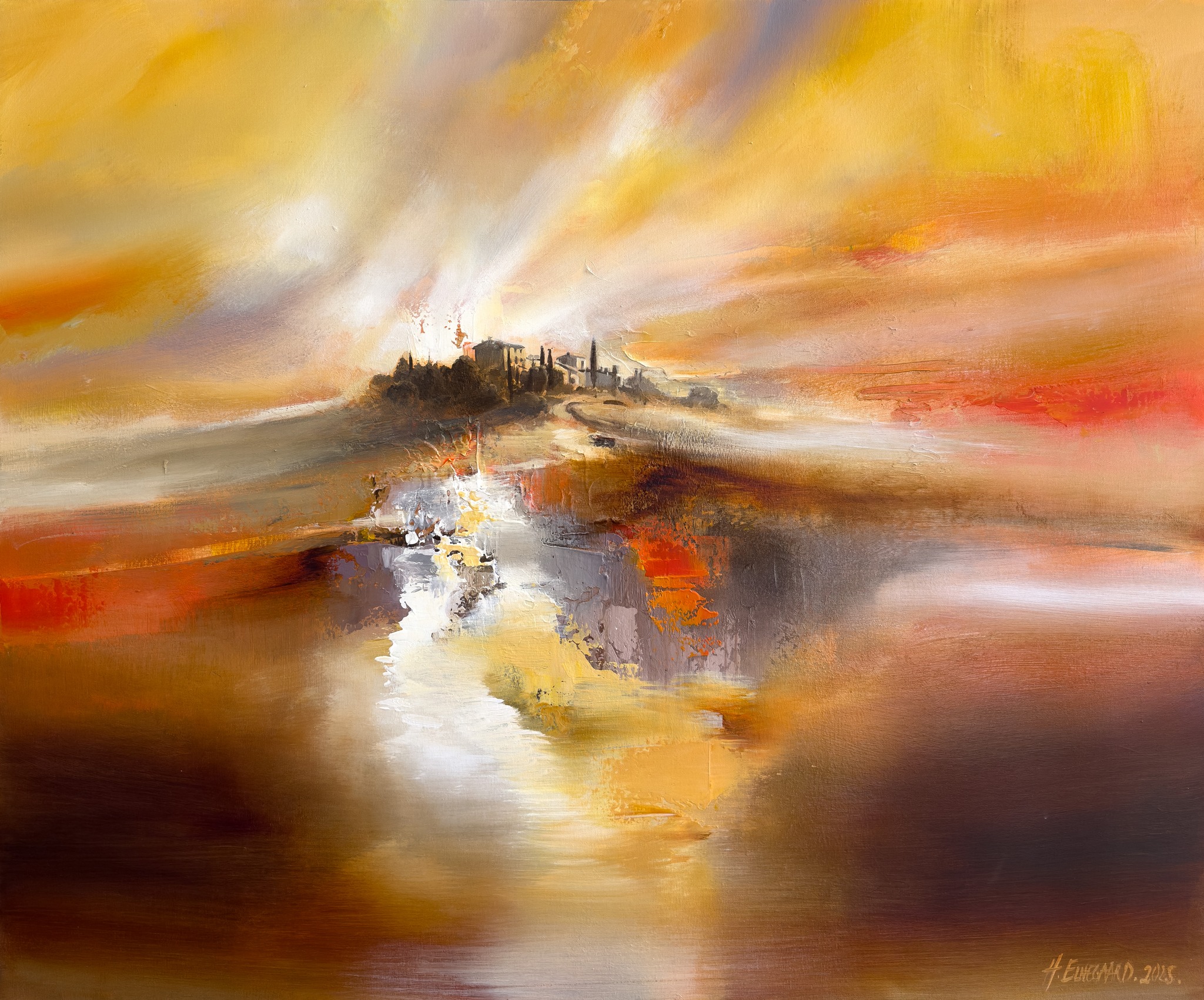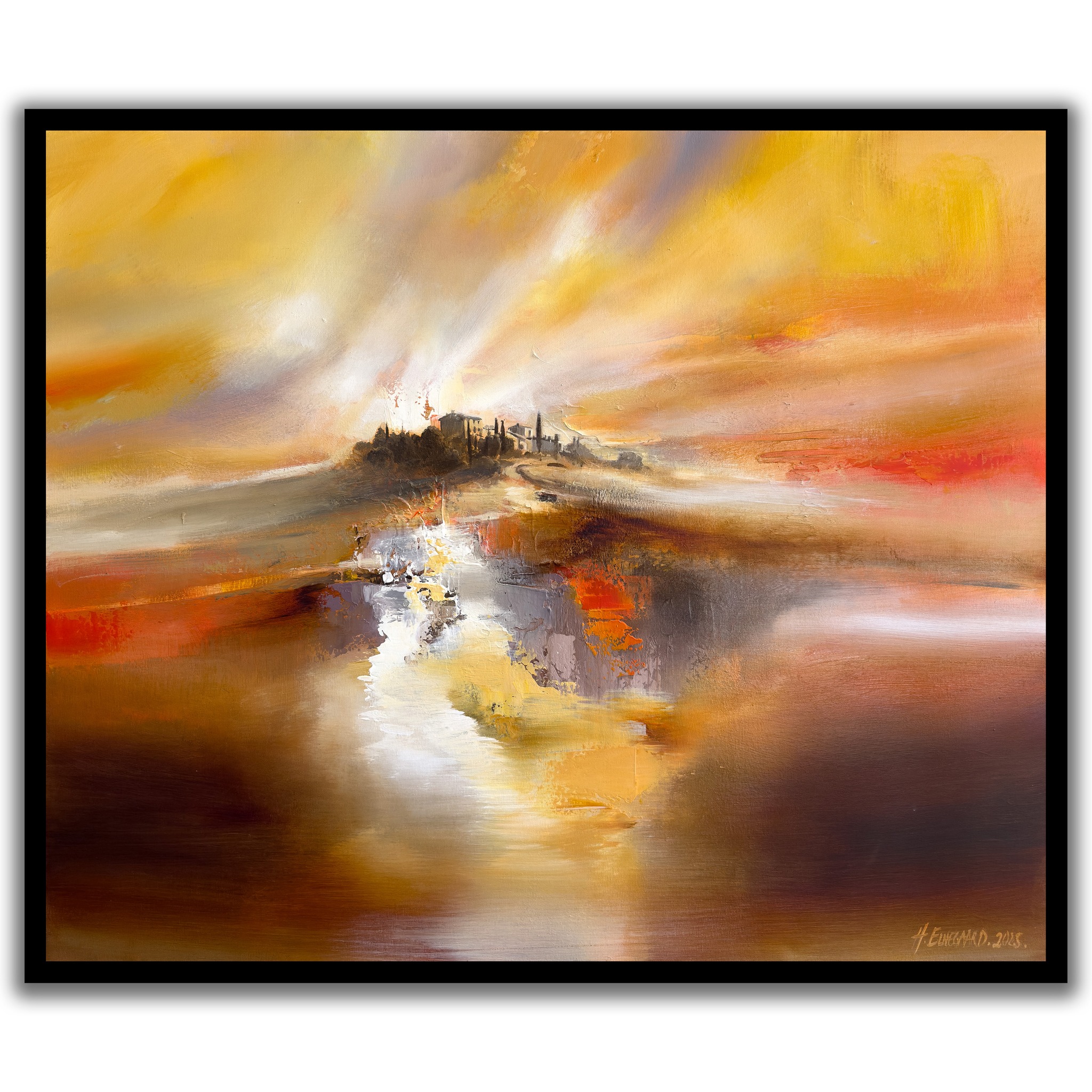 “Where the Light Lingers” af Henrik Elnegaard tager dig med til et blødt, toscansk landskab, hvor solen maler himlen i gyldne og varme toner. Det er et sted, hvor tiden står stille, og lyset omfavner alt med en stille varme, som en invitation til at blive lidt længere 🎨 ✨