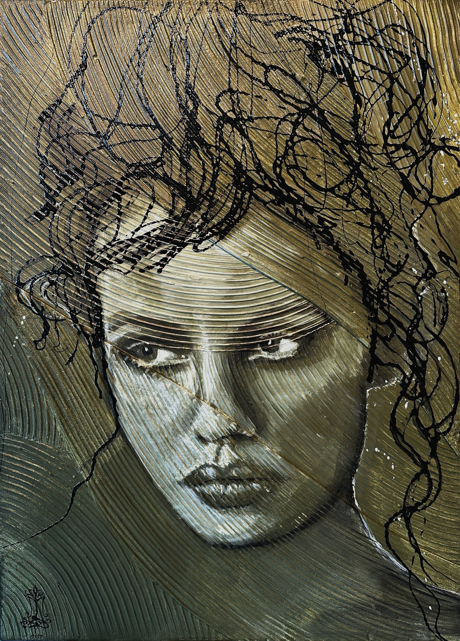 Den gyldne baggrund og de sorte, ekspressive streger tilfører en rå energi, der balancerer med de bløde, realistiske ansigtstræk. Øjnene – intense og eftertænksomme – trækker beskueren ind i en refleksion over indre tanker og følelser.